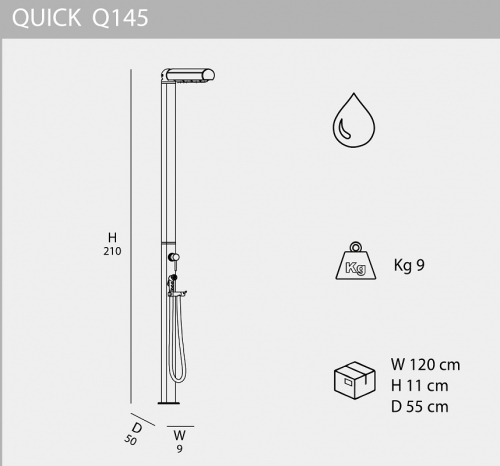 Инновационный и оригинальный душ Quick Q145 идеально подходит для установки как внутри помещения, так и на открытом воздухе, для сада, бассейна или пляжного домика. Чистый дизайн, элегантный и заботливый дизайн. Традиционные уличные души Quick отличаются тем, что их можно разобрать. Душ со смесителем горячей/холодной воды и ручным гибким шлангом. Душ особенно подходит для использования на открытом воздухе. Установка выполняется без проблем, простое подключение к постоянному водоснабжению холодной и горячей воды.