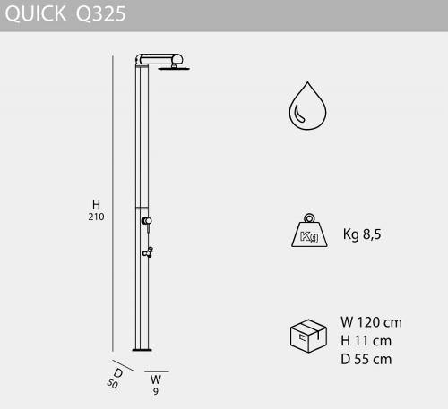 Инновационный и оригинальный душ Quick Q325 идеально подходит для установки как внутри помещения, так и на открытом воздухе, для сада, бассейна или пляжного домика. Чистый дизайн, элегантный и заботливый дизайн. Традиционные уличные души Quick отличаются тем, что их можно разобрать. Душ со смесителем горячей/холодной воды. В нижней части корпуса душа находится дополнительный кран, который удобно использовать для мытья ног. Душ особенно подходит для использования на открытом воздухе. Установка выполняется без проблем, простое подключение к постоянному водоснабжению холодной и горячей воды.