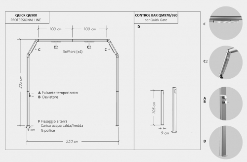 Инновационная душевая арка Sanity Gate QG900 идеально подходит для установки как внутри помещения, так и на открытом воздухе, для установки в входа в бассейн или в саду. Чистый дизайн, элегантный и заботливый дизайн. Конструкция полностью разборная, душ легко адаптируется к желаемым размерам. Оснащенный 4 душевыми насадками, он гарантирует охват всего прохода. Сверху расположены две секции по 1000 мм каждая с насадкой для душа. Душ QG900, имеющий кнопку-таймер, разработан специально для общественных мест, где необходимо сократить расход водных ресурсов. Установка выполняется без проблем, простое подключение к постоянному водоснабжению холодной и горячей воды.