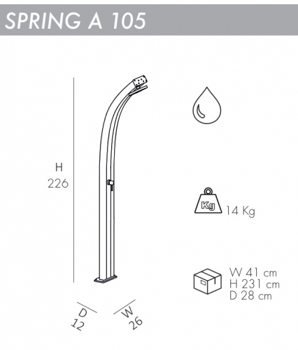 Летний душ Spring A105 с инновационным и оригинальным дизайном идеально подходит для установки как внутри, так и снаружи помещения, для сада, бассейна или пляжного домика. Чистый дизайн, элегантный и заботливый. Душ особенно подходит для использования на открытом воздухе. Установка выполняется без проблем, простое подключение к постоянному водоснабжению холодной и горячей воды.