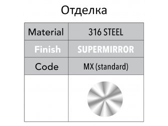 - Внешнее покрытие - зеркальный глянец Supermirror (MX). Поверхность полируется вручную, благодаря чему к идеально гладкой отделке не прилипают частицы соли или других вредных веществ, таких как известь или хлор. Возможно выполнение под заказ модели в матовой стальной отделке (BX), матовой черной отделке (MB) или по палитре RAL с желаемой степенью глянца (RL) - оплачивается отдельно. Однако матовые изделия будут требовать дополнительного технического обслуживания и ухода, так как их поверхность более чувствительна, чем у глянцевой стали.