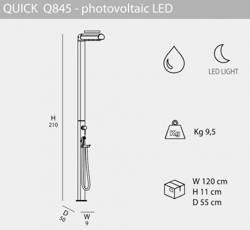 Инновационный и оригинальный душ со светодиодной подсветкой Quick Q845 идеально подходит для установки как внутри помещения, так и на открытом воздухе, для сада, бассейна или пляжного домика. Чистый дизайн, элегантный и заботливый дизайн. Традиционные уличные души Quick отличаются тем, что их можно разобрать. Душ со смесителем горячей/холодной воды и ручным гибким шлангом. Душ особенно подходит для использования на открытом воздухе в темное время суток. Установка выполняется без проблем, простое подключение к постоянному водоснабжению холодной и горячей воды.