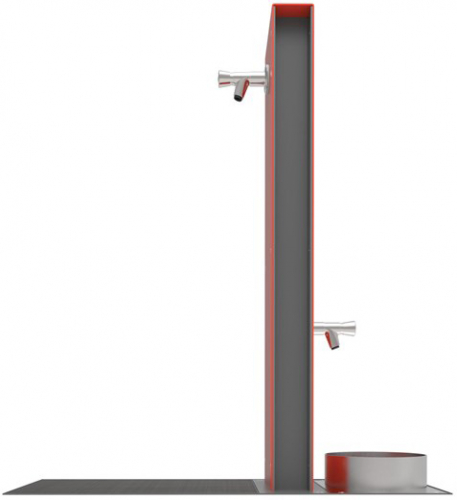 Модель оснащена двойным нажимным краном, панелями из стали с порошковым покрытием по шкале RAL и миской из нержавеющей стали. Можно нанести логотип способом лазерной резки (оплачивается дополнительно).