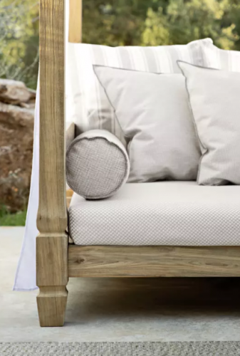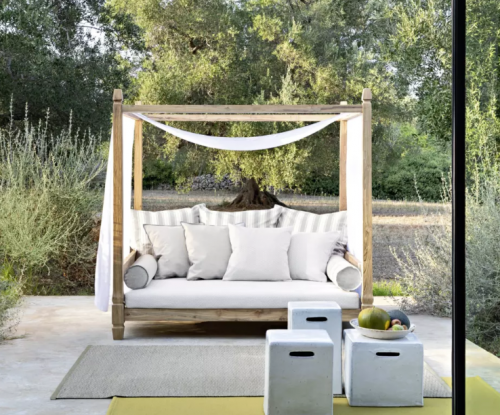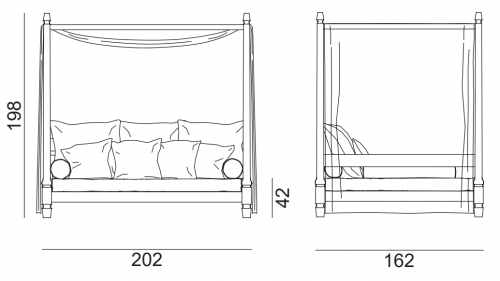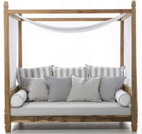 Диван с балдахином Jeko 07 – прекрасный пример колониального стиля в современном исполнении. Она входит в серию уличной мебели Jeko. Вся коллекция изготовлена из ECOTeak — это материал полученный из тиковых балок индонезийского дерева, извлеченных при сносе традиционных деревянных домов: пройдя тщательную переработку, шлифовку и ручную полировку стружкой и конопляной тканью, они стали идеальным материалом для изготовления мебели с действительно творческим подходом. Jeko 07 – это удобство без компромиссов, где бы вы ни отдыхали!