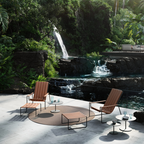 Помимо 70 различных цветов и фактур тканей, Вы также можете выбрать в качестве материалов для сиденья три вида высокопрочной искусственной кожи. Одетый в черную, коньячную или серо-коричневую ткань, имитирующую кожу, Strappy действительно выделяется и стирает грань между домашней и уличной мебелью.