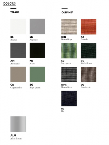 Варианты отделки каркаса: алюминий (ALU), сталь - серебристый (SK), белый (BS), антрацит (AN), черный (NE), капучино (CA), зеленый шалфей (SG).