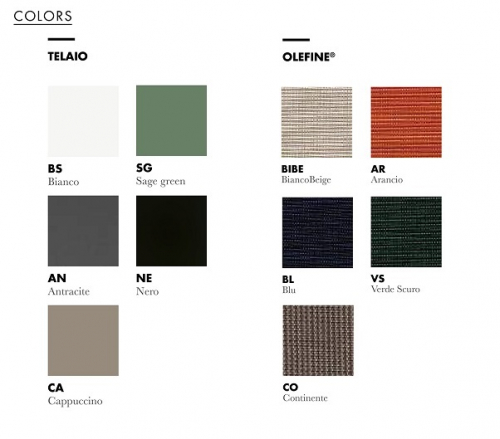 Варианты отделки каркаса: алюминий (ALU), сталь - серебристый (SK), белый (BS), антрацит (AN), черный (NE), капучино (CA), зеленый шалфей (SG).