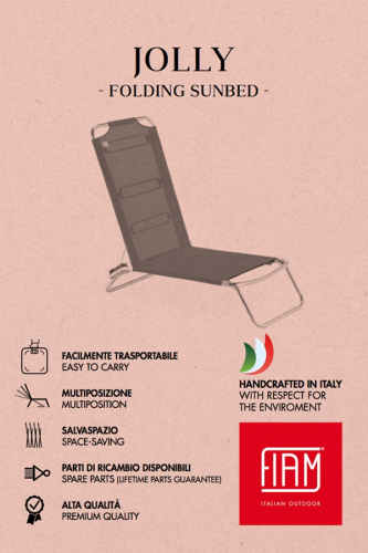 Когда требуется практичность, приходит время для кресла-шезлонга Jolly - очень легкая модель, которую можно разместить где угодно, чтобы получить одно из удовольствий жизни: солнечная ванна, которая заряжает позитивом и витамином D. Jolly имеет спинку, регулируемую в 3 положениях, имеет складную и компактную конструкцию, выполенную из алюминия. Оно также оснащено системой высокопрочных резинок.