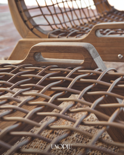 Каркас выполнен из тика - превосходного материала, известного во всем мире красотой текстуры поверхности и превосходными физическими характеристиками. Это прочная, водостойкая древесина, устойчивая к соленым средам и разным погодным условиям. Для производства мебели Unopiù использует только самый доступный и прочный тик из индонезийских лесов, и только тот, который обладает высочайшим качеством - из центра ствола. Качество и экологическая устойчивость: тик Unopiù поступает только с сертифицированных, гарантированных и контролируемых государственных плантаций, где каждый спил дерева заменяется новым.