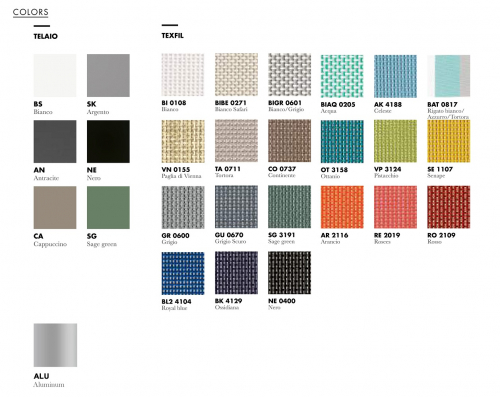 Варианты отделки каркаса: алюминий (ALU), сталь - серебристый (SK), белый (BS), антрацит (AN), черный (NE), капучино (CA), зеленый шалфей (SG).
