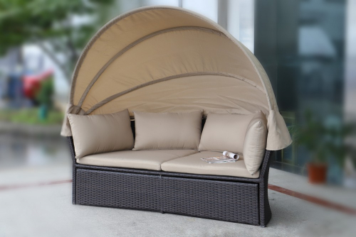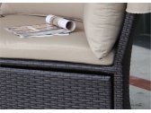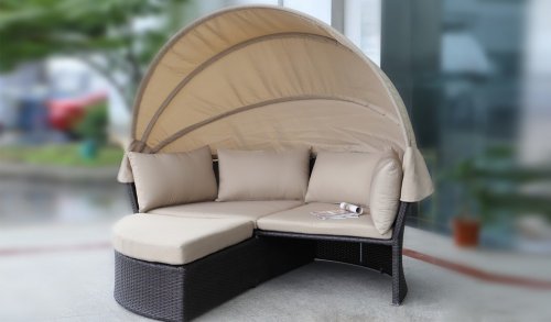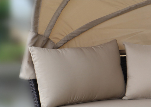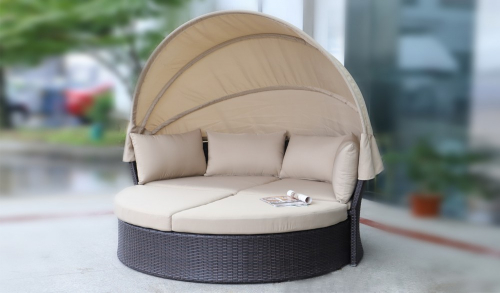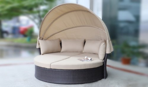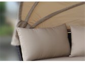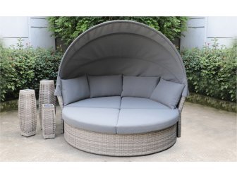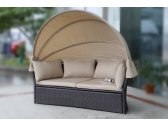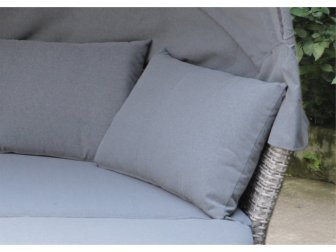 Единая конструкция круглого дивана трансформируется в диван и пуфы или кресла и пуфы, а регулируемый навес и подушки на сиденье и спинке обеспечивают комфортный отдых на свежем воздухе.
