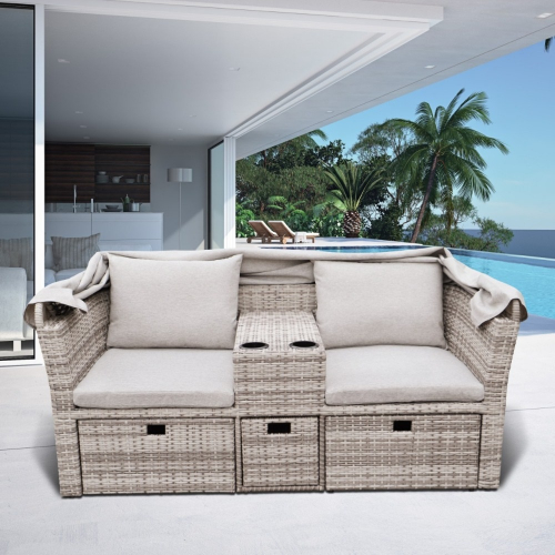 Комплект-трансформер AFM-330G идеально подходит для отдыха на террасе, зоны возле бассейна или на пляже. Каркас выполнен из стали, плетение - из качественного искусственного ротанга, благодаря чему мебель не выгорает на солнце, устойчива к осадкам и перепадам температуры. Мягкие подушки выполнены из ткани с водоотталкивающей пропиткой. Диван укомплектован столиком с подстаканниками и ящиком для хранения. Легко трансформируется - пуфы задвигаются в диван, тент складывается.