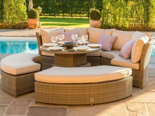 В составе комплекта: два дивана, две оттоманки и в центре стол с декингом. Высококачественная лоза из полиротанга бежевого цвета, стойкая к любым атмосферным явлениям. Крепкий стальной каркас с полимерным антивандальным покрытием и отличным качеством сварки. Изделие сплетено вручную мастерами под жестким контролем качества на каждом этапе производства. Лоза максимально приближена по рельефу и текстуре к естественному материалу. Идеально подходит для использования на улице и внутри помещения в любую погоду. Не боится воды, солнца и минусовой температуры. Комплект можно использовать, как обеденную группу со столом, а так же как просто большой диван (стол опускается вниз). Подушки в комплекте. Оттенки на фото могут отличаться от представленного образца. Стол с декингом (без стекла). На него в комплекте подушка.