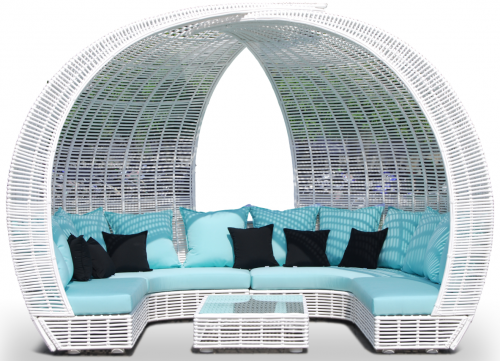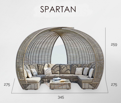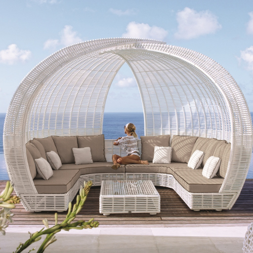 Роскошная беседка Spartan из искусственного ротанга цвета White Mushroom и подушками из ткани Sunbrella. Обладая великолепным шармом, благодаря своим гармоничным формам, вдохновленным парусом, диван-беседка выделяется элегантностью и эксклюзивностью на любом открытом пространстве.