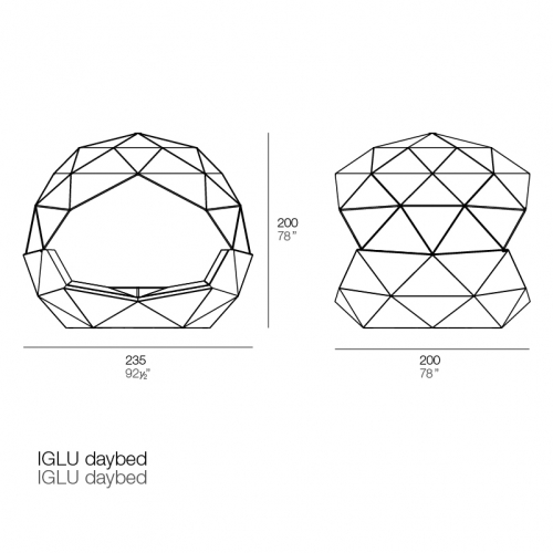 Новый лежак Iglu представляет собой геометрическое место для укрытия и наслаждения. Этот дизайнерский предмет вдохновлен геодезическими куполами Фуллера середины 20-го века. Задуманный как место для укрытия и наслаждения, модель демонстрирует геометрические формы снаружи, а внутри - более мягкие линии и формы. Купол образован соединенными треугольниками с легкой тканью, которая обеспечивает интересную комбинацию света и тени.