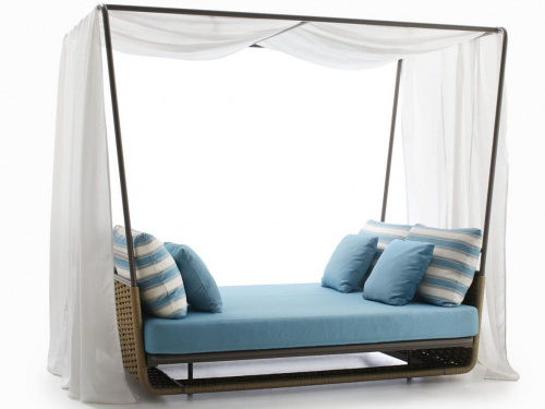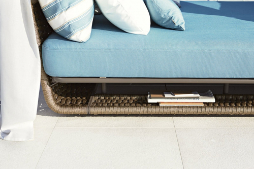 Укрытый балдахином лежак Portofino имеет алюминиевый каркас с порошковым покрытием Terra, обвитый морским канатом Nautic rope sand. Восхитительный, обаятельный, поэтичный, этот лежак отлично подходит для создания сказочной установки на просторном открытом пространстве. Отлично подходит для отдыха на свежем воздухе. Этот элемент является эксклюзивным дополнением для обстановки открытой площадки: сад, террасы, бассейн и wellness -зоны идеально подходят для этого модного шезлонга.
