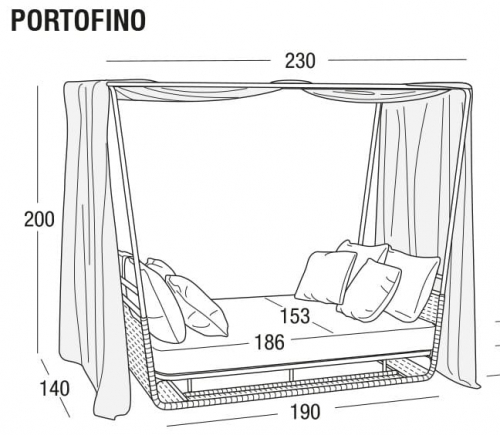 Коллекция Portofino имеет алюминиевый каркас, оплетенный морским канатом - роскошным и прочным плетением в песочном цвете. Удивительный плетеный лежак с балдахином имеет светлый образ и замечательный морской вид.