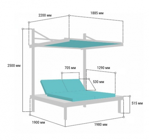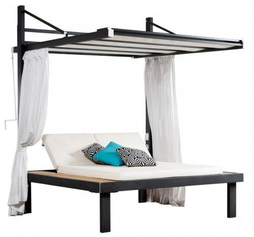 - В комплект входит: двухместный лежак, матрас, фиксированная крыша, открывающиеся боковые шторы.