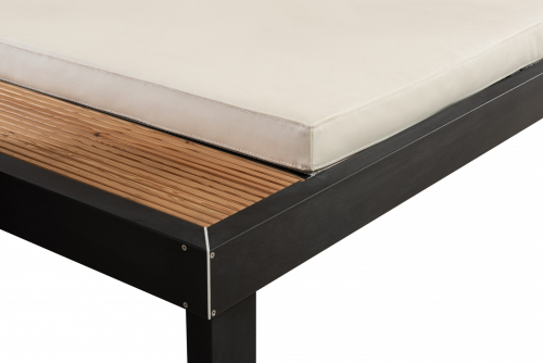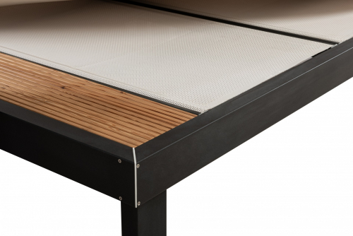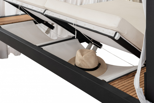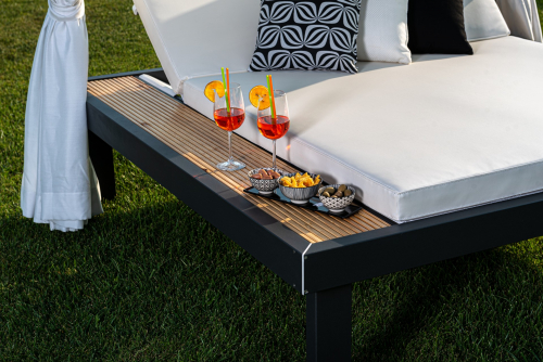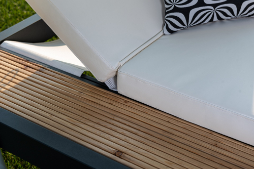 Основа изготовлена из алюминиевых профилей, сваренных в местах стыков методом TIG, которые служат каркасом для полотен ПВХ. Эта особенность позволяет использовать лежаки даже без матраса, сохраняя при этом высокий уровень комфорта, в том числе благодаря независимым 4-позиционным спинкам. Идеальное решение для эксклюзивных пространств, где важна каждая деталь.