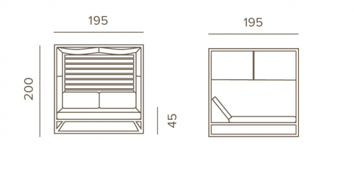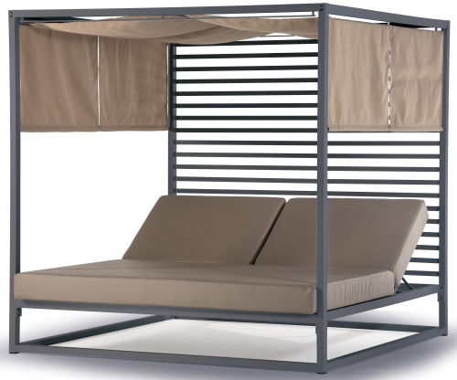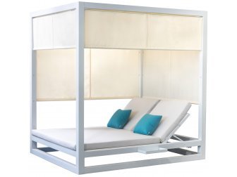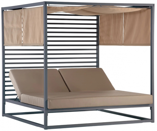 Antigua - шезлонг для двоих. Алюминиевый каркас и матрасы из водоотталкивающей экокожи обеспечивают максимальное расслабление, регулируемая спинка позволит найти самое удобное положение для отдыха, а высоту двойных штор можно менять таким образом, чтобы жаркое солнце не мешало релаксу.