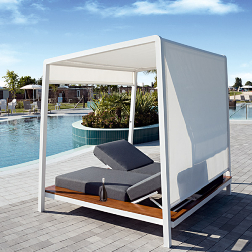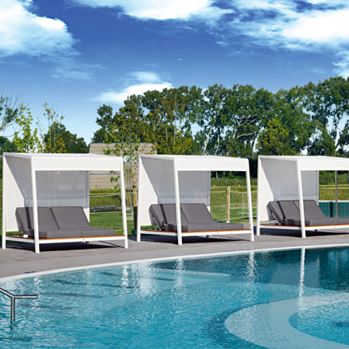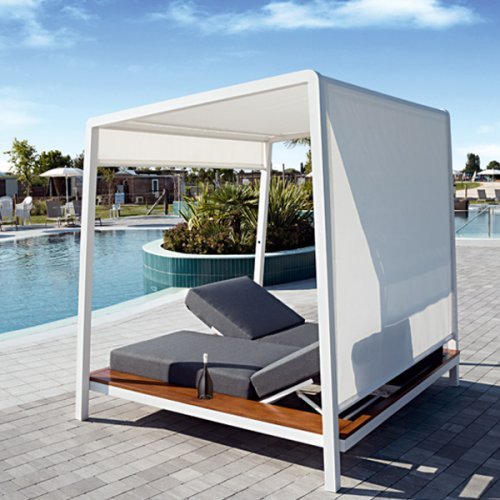 Каждую спинку лежака можно откинуть отдельно. Ткань матраса состоит из 100% полиэстера и наполнена быстросохнущей пеной. Крыша из ПВХ регулируется для обеспечения превосходной защиты от солнечных лучей.