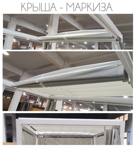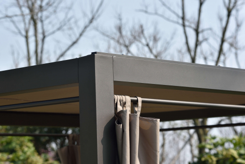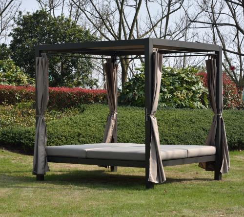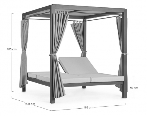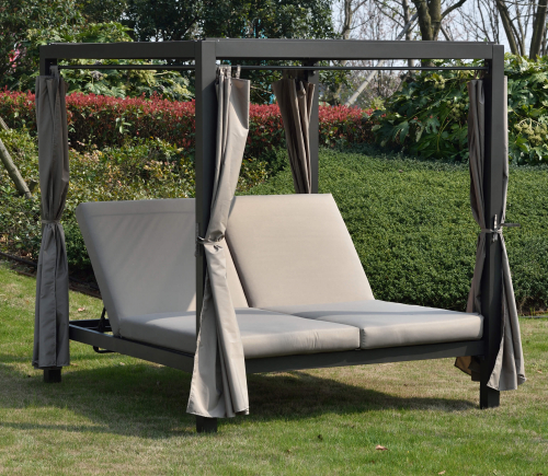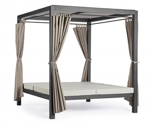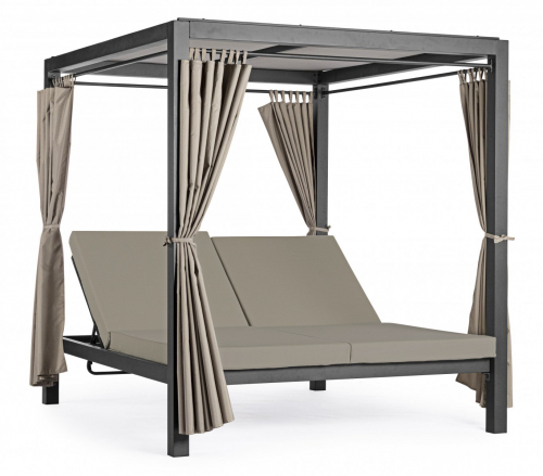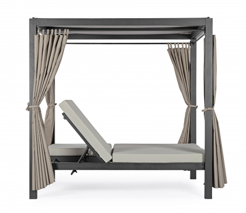 Крыша и боковые шторы выполнены из полиэстера и обеспечивают приятную тень от солнца и возможность создать атмосферу уединения.. Зона лежаков разделена на две части, спинки можно регулировать независимо друг от друга. Высота спинки регулируется в четырех положениях. Мягкие матрасы с чехлами из полиэстера обеспечивают настоящий комфорт.