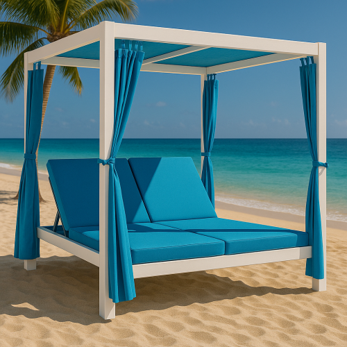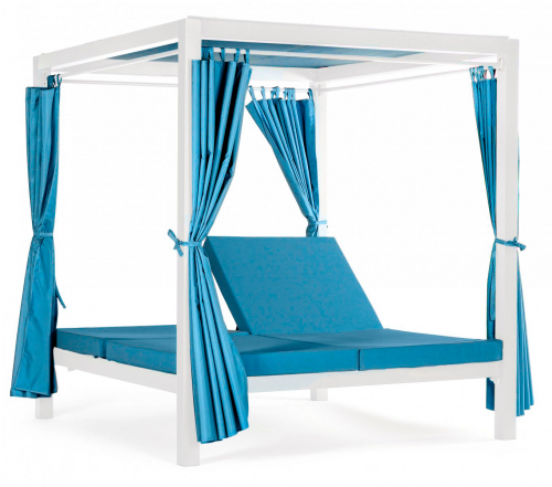 Крыша и боковые шторы выполнены из полиэстера и обеспечивают приятную тень от солнца и возможность создать атмосферу уединения.. Зона лежаков разделена на две части, спинки можно регулировать независимо друг от друга. Высота спинки регулируется в четырех положениях. Мягкие матрасы с чехлами из полиэстера обеспечивают настоящий комфорт.
