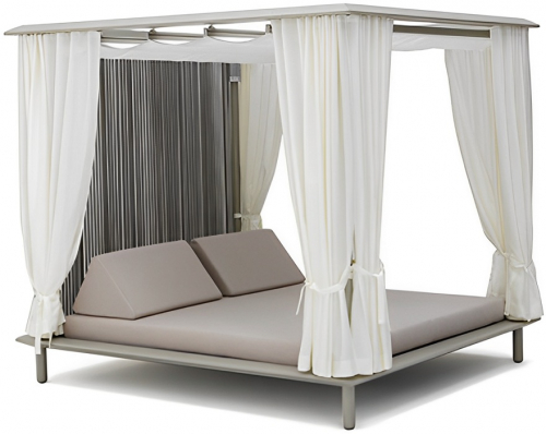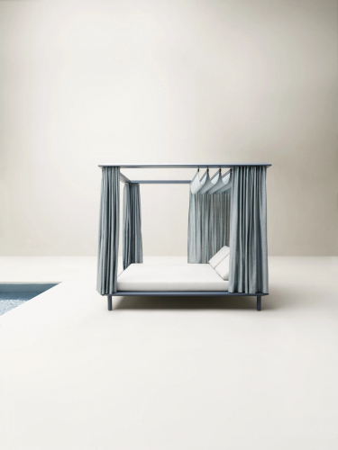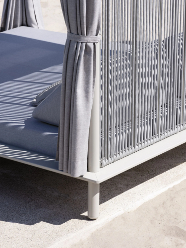 Отличительными чертами Sunmoon являются элегантная веревочная диафрагма, которая действует как экран, боковые шторы и верхняя крыша, оснащенная удобной раздвижной системой для дозирования света и тени в зависимости от времени суток. Задача материалов - сочетать надежность со способностью передавать эстетические ценности и тактильные ощущения, которые усиливают удовольствие от отдыха на открытом воздухе.