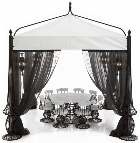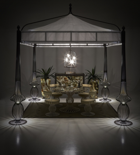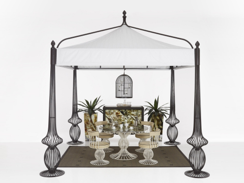 Мебель, полностью сделанная из кованого железа, вдохновлена сказочными образами, которые не останутся незамеченными. Кованое железо превращается в беседки, лампы и величественные вазы. Эта коллекция создана с использованием железных прутьев, которые принимают извилистые формы благодаря мастерству мастеров DFN. Шатер Sole был одним из первых изделий, рожденных творчеством дизайнера, который хотел создать монументальную беседку для своей уличной коллекции, которая должна быть красивой в любое время дня. Неслучайно вся мебель в коллекции имеет конструкции, оснащенные интегрированными элементами освещения. Элементы освещения добавляют яркости, которая сочетается с твердым железом, создавая беспрецедентный драматический вид. Концепция total look остается фундаментальной особенностью этой коллекции, которая переосмысливает железо, превращая его во что-то роскошное и элегантное. В то же время все элементы были обработаны, чтобы гарантировать длительное использование в наружных условиях. Часто используется в сочетании с элементами из коллекций Sirio и Canopo.