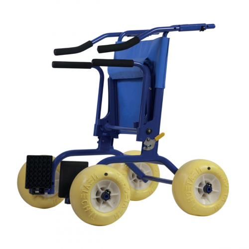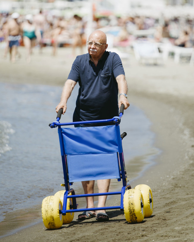 Rider - это ходунки для пожилых людей или людей с ограниченными физическими возможностями, которые хотят передвигаться по мягким и неровным грунтам, на которых невозможно использовать традиционные опоры. Колеса, всегда обеспечивающие максимально возможную поверхность для опоры на землю, позволяют передвигаться не только по песку или снегу, но и по другим типам несвязных почв, все это делает этот продукт незаменимым помощником, который можно использовать в любое время года и во всех контекстах. Складное сиденье позволяет пользователю присесть для остановки в пути или насладиться осмотром достопримечательностей. Спинка и сиденье изготовлены из прочной ткани, отличающейся быстрым высыханием, не впитывающей песчинки.