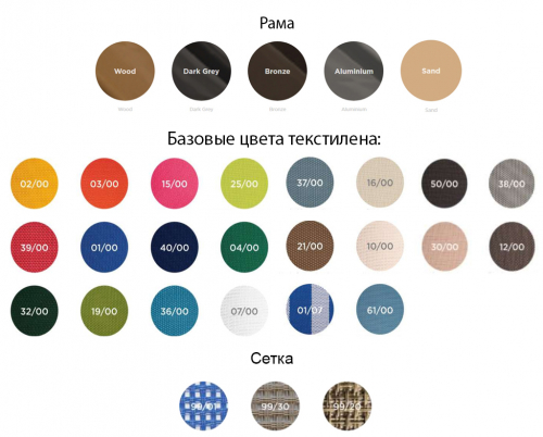 Варианты отделки каркаса: песочный (sand), деревянный (wood), темно-серый (dark grey), бронзовый (bronze), алюминиевый (aluminium).