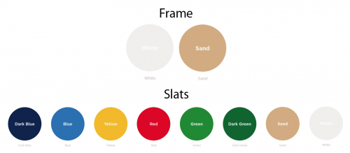 Варианты отделки планок: белый (white), песочный (sand), темно-синий (dark blue), синий (blue), желтый (yellow), красный (red), зеленый (green), темно-зеленый (dark green).