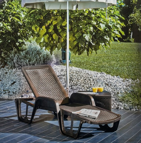 Штабелируемый пластиковый шезлонг с эффектом плетения ротанга.