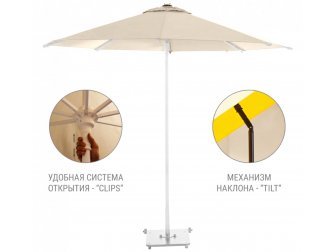 Kiwi Clips - профессиональный зонт с центральной опорой из алюминия, что обеспечивает высокую устойчивость модели. Он защитит от ярких солнечных лучей и создаст приятную затененную атмосферу в частных садах, открытых летних площадках кафе, баров и ресторанов, зоны возле бассейна.