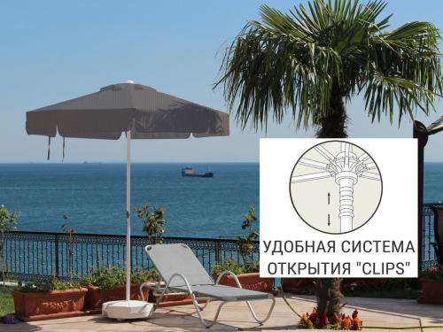 Kiwi Clips - профессиональный зонт с центральной опорой из алюминия, что обеспечивает высокую устойчивость модели. Он защитит от ярких солнечных лучей и создаст приятную затененную атмосферу в частных садах, открытых летних площадках кафе, баров и ресторанов, зоны возле бассейна.