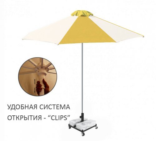 Kiwi Clips - профессиональный зонт с центральной опорой из алюминия, что обеспечивает высокую устойчивость модели. Он защитит от ярких солнечных лучей и создаст приятную затененную атмосферу в частных садах, открытых летних площадках кафе, баров и ресторанов, зоны возле бассейна.