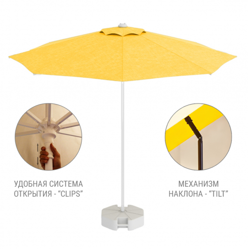 Kiwi Clips - профессиональный зонт с центральной опорой из алюминия, что обеспечивает высокую устойчивость модели. Он защитит от ярких солнечных лучей и создаст приятную затененную атмосферу в частных садах, открытых летних площадках кафе, баров и ресторанов, зоны возле бассейна.