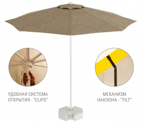 Kiwi Clips - профессиональный зонт с центральной опорой из алюминия, что обеспечивает высокую устойчивость модели. Он защитит от ярких солнечных лучей и создаст приятную затененную атмосферу в частных садах, открытых летних площадках кафе, баров и ресторанов, зоны возле бассейна.