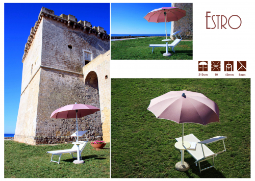 Профессиональный пляжный зонт Estro - это новинка среди последних творений: он следует за движением солнца и обеспечивает тень на все дневные часы. Его особенность - согласованность между изогнутыми и традиционными спицами.
