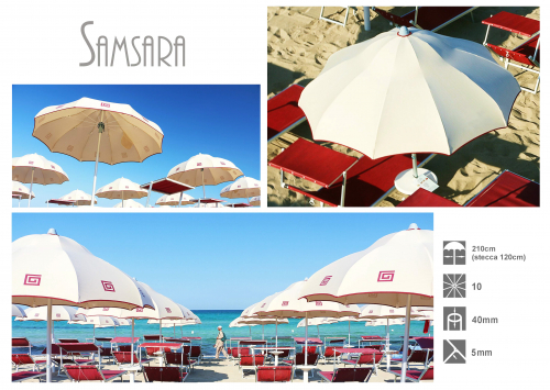 Профессиональный пляжный зонт Samsara - одно из последних творений CiCCAR. Произведенная после тщательного исследования дизайна, эта модель была разработан для одного из самых известных пляжей Salento, известного во всем мире, благодаря которому зонт имеет свое название.