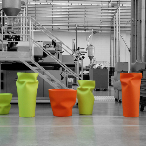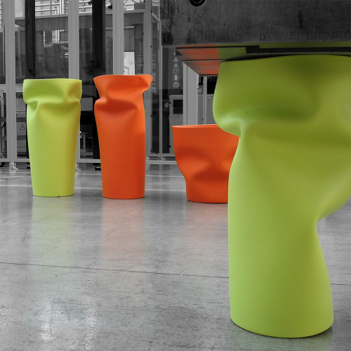 Saving/Space/Vase подвергается процессу "сжатия" сразу после извлечения из формы, когда материал все еще остается частично пластичным в течение нескольких минут. Оригинальный промышленный объект приобретает новый оттенок, обогащенный эстетикой, которая время от времени меняется: ремесленное производство, которое создает уникальные, но промышленные изделия.
