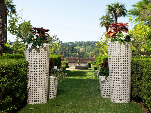 Элегантное плетеное кашпо Wezen с алюминиевым каркасом, оплетенным вручную искусственным ротангом, имеет характерный узор венской соломы. Мебель из синтетического волокна VIRO® ручной работы, разработанная для длительного использования на открытом воздухе и, следовательно, устойчивая к любым атмосферным воздействиям. Обладает устойчивостью к перепадам температур (от -70°C до +80°C), ультрафиолетовым лучам, не теряет цвет, влагостойкостью, устойчивость к соли и хлору, плесени. Это нетоксичный экологичный материал (на 100% перерабатываемый), по ощущению как натуральный материал. Корпус мебели реализуют из крашеного алюминия, покрытого плетением из специального синтетического волокна того же цвета. Посмотреть палитру материалов Samuele Mazza.