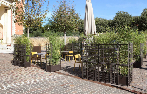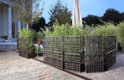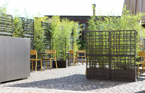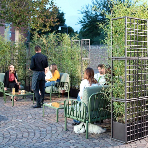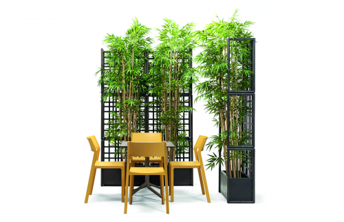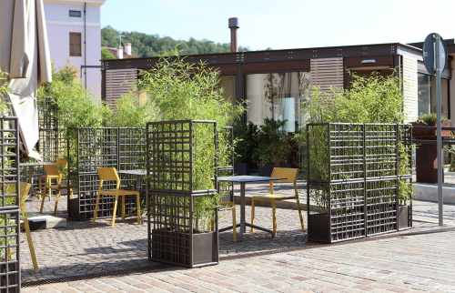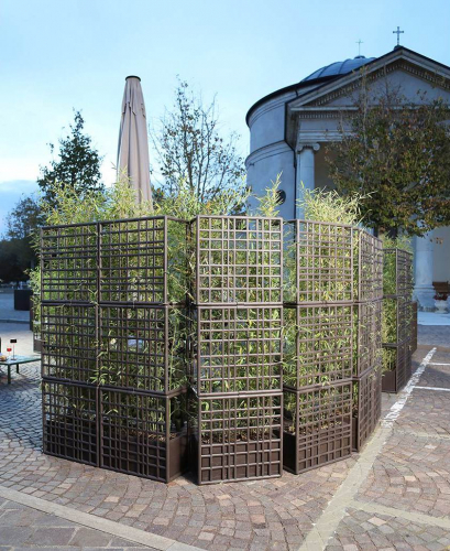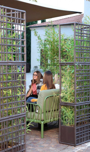 Sipario – это оригинальная модульная система уличных ограждений из регенерированного стеклопластика с самополивающимся кашпо. Модули с асимметричной сеткой можно соединять вместе без использования винтов и свободно комбинировать по вертикали или горизонтали, дополняя внешний вид окружающего пространства и создавая уединенный уголок. Линейные, ломаные и изогнутые модульные конфигурации помогают стильно и композиционно разделить пространство в саду. Отличное решение для летних площадок кафе и ресторанов.