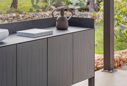 Комфорт, эстетика и функциональность – это три грани краеугольного камня, которые необходимо учитывать при создании уголка на открытом пространстве, поскольку мебель должна быть привлекательной, но также подходящей для различных погодных условий. Ninfea – это новая линейка комодов для хранения вещей и принадлежностей на улице. Модель доступна в гамме ярких цветов с устойчивым к царапинам верхним покрытием. Помимо хранения вещей, его можно использовать как разделитель пространства. Гравированный узор на дверцах напоминает ту же флористическую тематику, что и на других изделиях фабрики Fast. Такой выбор сделан из соображений эстетической согласованности, что делает Ninfea совместимой со всеми другими коллекциями, создавая отличительный, но в то же время гармоничный эффект. Бортик обеспечивает дополнительную безопасность и предотвращает падение вещей с поверхности комода.