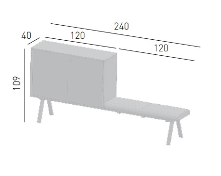 Комод офисный состоит из каркаса 2027 и модуля с раздвижными дверями и замками (по 1 перегородке и 1 полке в каждом отсеке), а также мягкого сиденья.