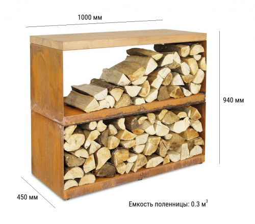 Поленницу можно использовать как самостоятельный объект, а можно комбинировать с поленницами в других размерах, создавая уникальное пространство для отдыха в вашем саду.