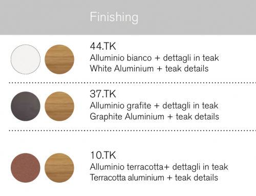 Flair - коллекция, которая имеет стильный внешний внешний вид, удобные формы и легко адаптируемый дизайн. Идеально подходит для обстановки открытых пространств. Вся алюминиевая мебель Atmosphera имеет порошковое покрытие белого или графитового цветов. Порошковое покрытие обеспечивает устойчивость поверхности к ударам и царапинам. Изделия хорошо подходят для того, чтобы их можно было оставлять на улице круглый год и легко чистить. Мебель Atmosphera выполнена из тика, который выращивают на экологически устойчивых индонезийских плантациях. Богатое таниновым маслом, оно обеспечивает отличную стойкость даже в экстремальных условиях. Древесина устойчива к влажности, ультрафиолетовым лучам, холоду и резким перепадам температур. Поэтому это отличный материал для уличного применения. При длительном хранении тиковой мебели на открытом воздухе ее пигментация растворяется, приобретая мягкий серебристо-серый оттенок. Поскольку на начальном этапе это естественный процесс, серебристо-серый цвет может проявляться неравномерно. Чтобы сохранить первоначальный цветовой тон, фабрика предлагает специальный набор по уходу для использования один или несколько раз в год.