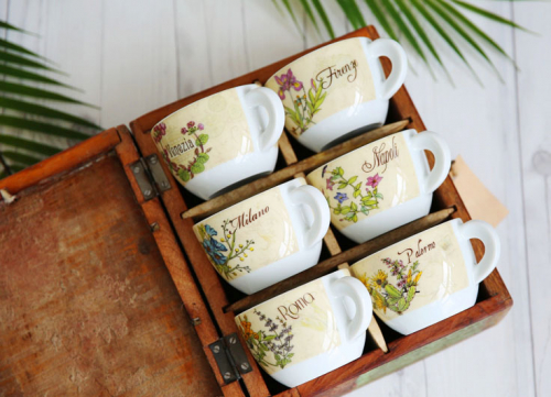 Коллекция Edex Italia Fiorita представляет собой 6 различных деколей, на которых представлена цветущая Италия. Шесть самых главных городов: Рим, Флоренция, Палермо, Милан, Венеция, Неаполь, и изображение произрастающих там цветов. Окунитесь в атмосферу цветущей Италии с чашками Edex Italia Fiorita.