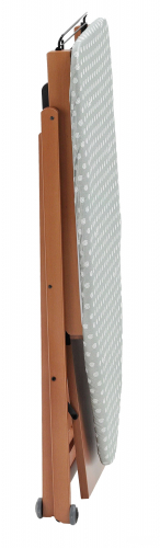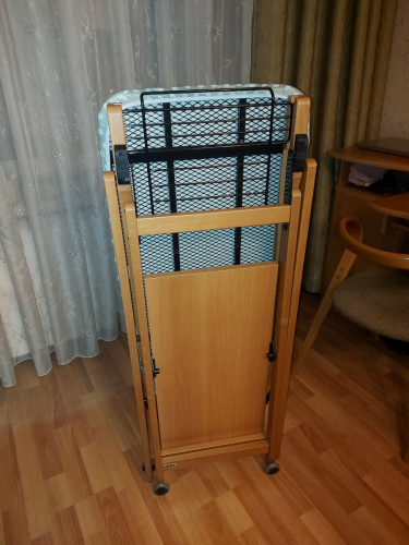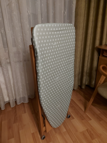 Благодаря складной конструкции она не займёт много места в вашем доме, в сложенном виде её можно хранить в шкафу или кладовой. Её конструкция также позволяет регулировать её высоту во время подготовки к работе (от 84 до 93 см). Специальные колёсики помогут вам без труда перемещать её по дому.