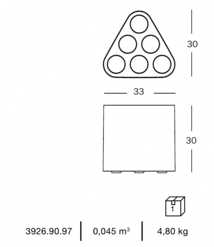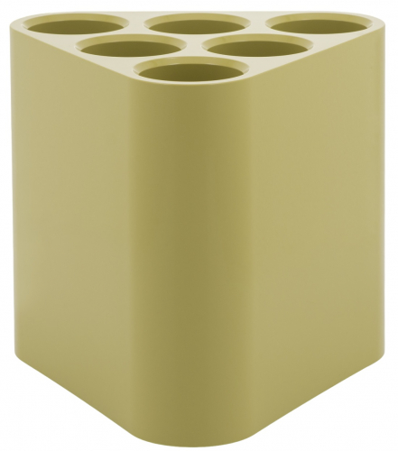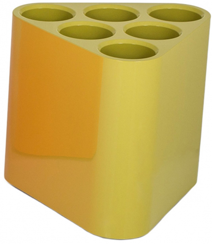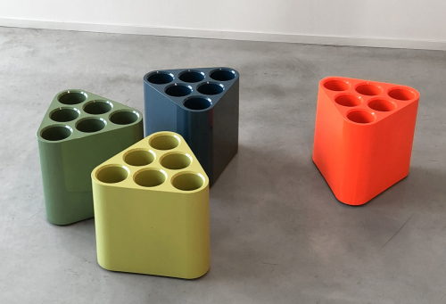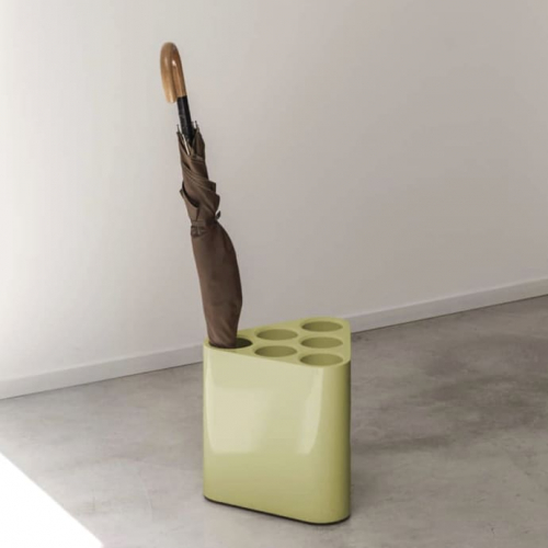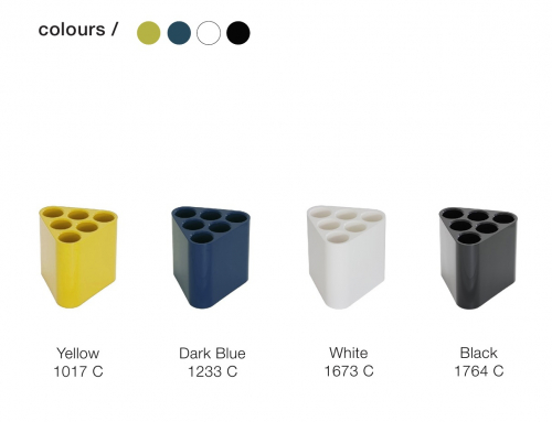 Треугольная форма была выбрана потому, что она хорошо вписывается в любую точку комнаты, включая углы. Простая композиция отверстий позволяет легко вмещать свернутые или развернутые зонтики любого размера. Подставка Poppins представляется серьезной и игривой; глянцевый пластик подчеркивает свои водонепроницаемые свойства, а форма напоминает нам игру - как треугольник, используемый в бильярде или снукере. По счастливой случайности это также идеальная форма для винных бутылок!" - Edward Barber & Jay Osgerby.